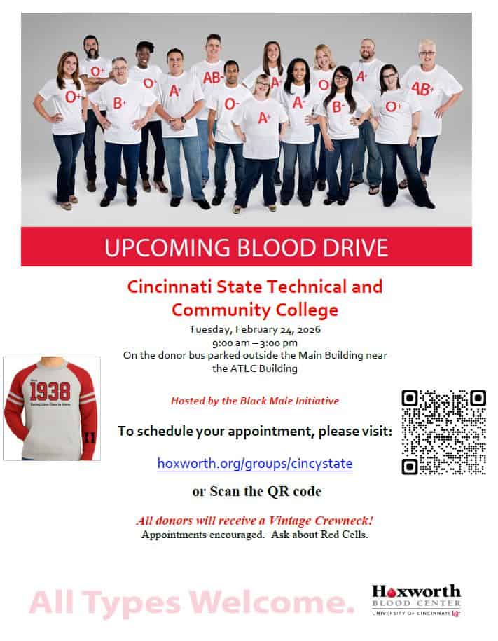 Help save the lives of local patients by donating blood! Hoxworth is coming to Cincinnati State and is the only provider of blood to more than 30 local hospital and your donation can help someone in your community.