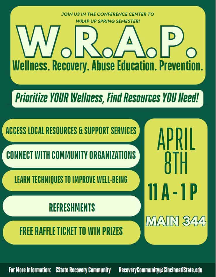 This event is in the past Cincinnati State / Events / W.R.A.P. – Wellness. Recovery. Abuse Education. Prevention W.R.A.P. – Wellness. Recovery. Abuse Education. Prevention When April 8, 2025 11:00 am — April 8, 2025 1:00 pm Where 3520 Central Parkway Main 344 Cincinnati, OH 45223 Questions CSTATE Recovery Community recoverycommunity@cincinnatistate.edu Upcoming Events View Events Calendar
