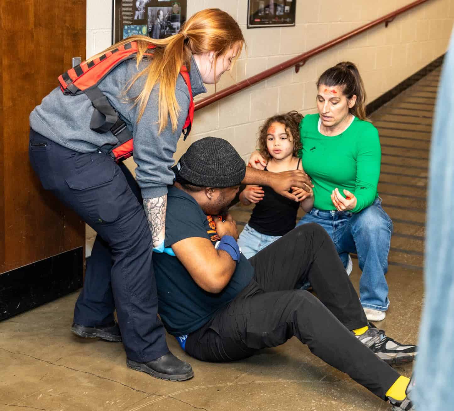 The simulation started in a hallway and various classrooms where “victims” were assessed and then moved to emergency care or to triage for less serious wounds.