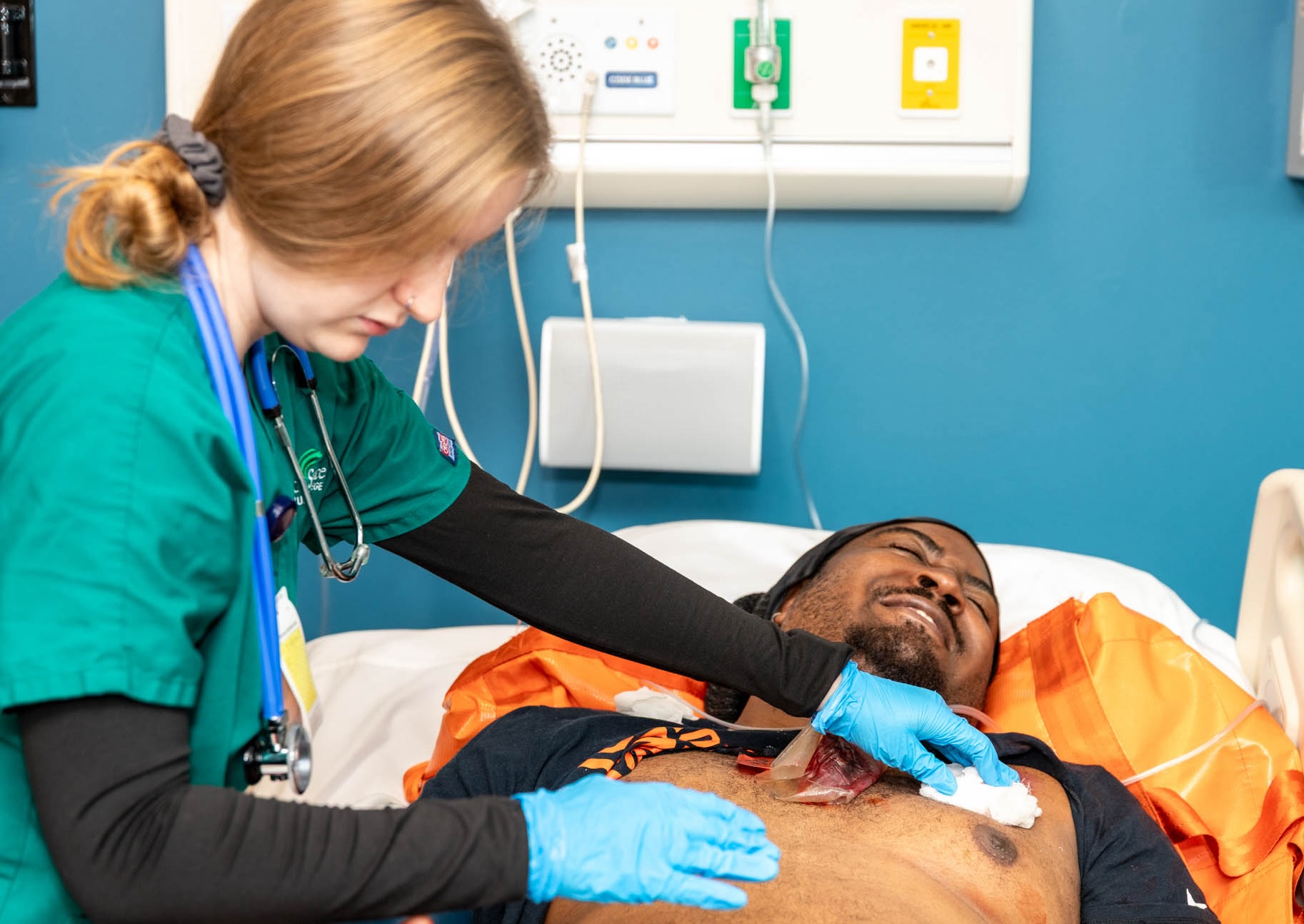 In addition to treatment for physical wounds, mental health professionals were on hand to help deal with trauma experienced by those caught up in the “disaster.” Some of the students who started their “treatments” with live volunteers completed the simulation while working with the “robot patients” available in the HPS Simulation Lab.