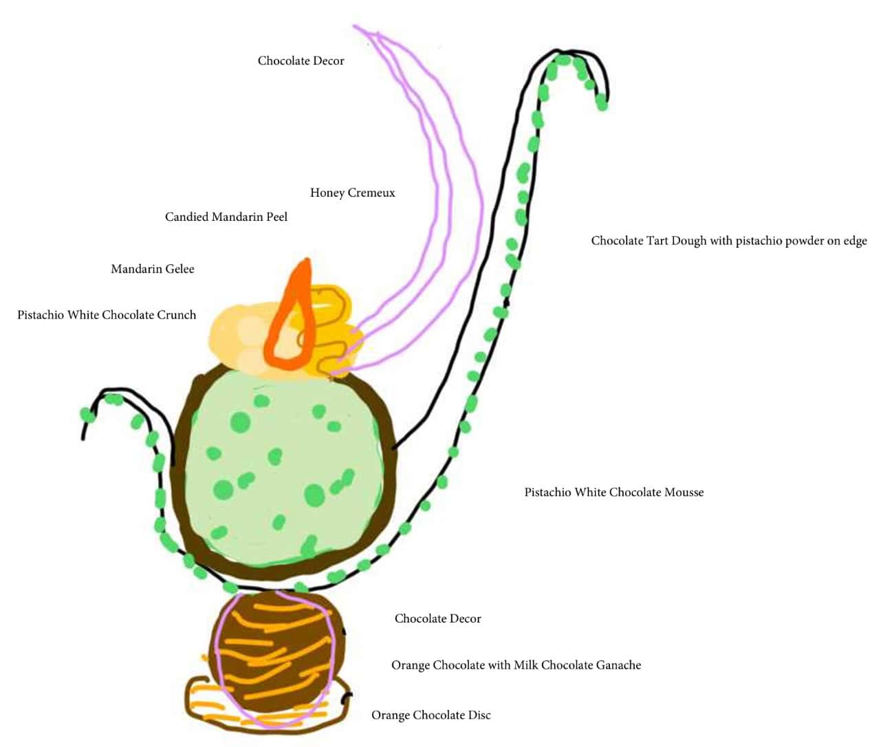 The finished dessert was required to be 66% chocolate, using two different flavors of chocolate along with at least five other components, including an “artistic, handmade garnish or ornament.”